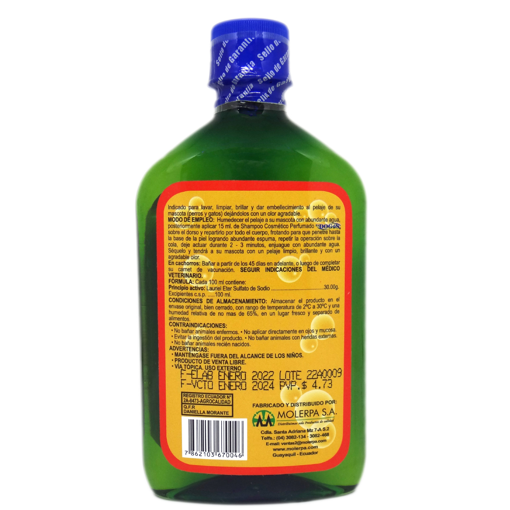 Shampoo Canino Cosmético Perfumado P.A. DOG’S está indicado para lavar, limpiar, brillar y dar embellecimiento al pelaje de su mascota (perros y gatos), dejándolos con un olor agradable.